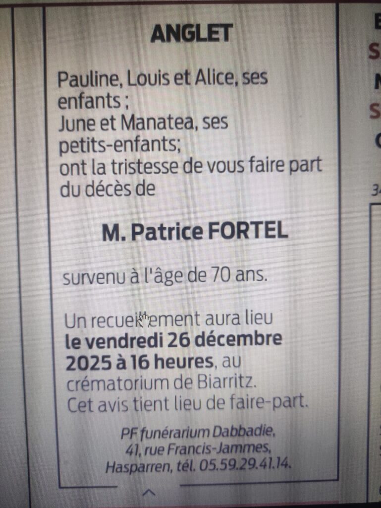 Ce message pour vous informer de la disparition subite de Patrice FORTEL à l’âge de 70 ans