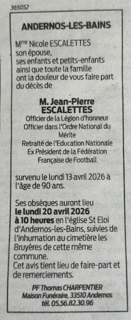 Nous vous informons du décès de Jean Pierre ESCALETTES à l’âge de 90 ans